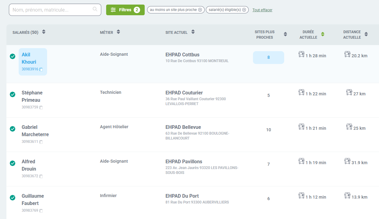✅ Identification des salariés qui ont des sites plus près de chez eux
